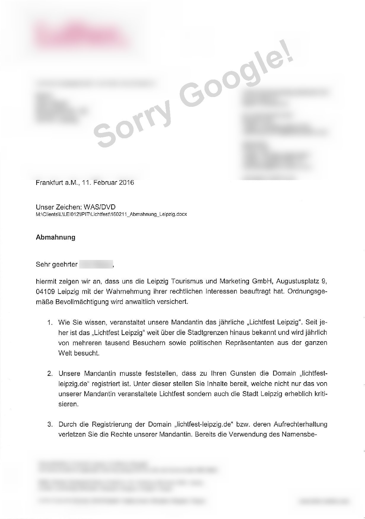 Heute beauftragen Burkhards Untergebene mit Leipziger Steuergeldern Anwälte aus Frankfurt am Main. Die fordern die Löschung und Herausgabe dieser Internetseite, drohen mit Geldstrafe, Klage und richten Sperren ein, damit die Internetadresse nicht in "falsche" Hände gerät. Einen solchen Vorgang nennt man - Zensur. Ihr erinnert Euch: Gegen Zensur sind die Menschen 1989 auf die Straße gegangen und der Burkhard veranstaltet dafür ein Lichtfest. Klingt verwirrend, ist es auch. Da Ihr sicherlich wissen möchtet, was dem Burkhard so mißfallen hat, klickt doch einfach auf den folgenden Link: